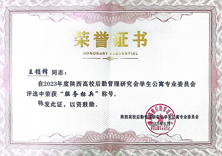 會(huì)上,陜西高校學(xué)生公寓專業(yè)委員會(huì)秘書長(zhǎng)賈亞新宣讀了《2023年度陜西高校學(xué)生公寓先進(jìn)集體、服務(wù)標(biāo)兵、優(yōu)秀員工》的表彰決定。我校后勤保障處獲得“陜西高校學(xué)生公寓先進(jìn)集體”榮譽(yù)稱號(hào),后勤保障處副處長(zhǎng)殷譚鋒被評(píng)為陜西高校學(xué)生公寓“優(yōu)秀員工”,后勤保障處職工王鎖鋒被評(píng)為陜西高校學(xué)生公寓“服務(wù)標(biāo)兵”。后勤保障處處長(zhǎng)李彥廣作為嘉賓之一為優(yōu)秀員工代表頒發(fā)獎(jiǎng)狀。