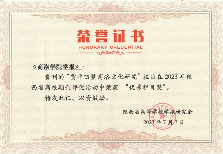 7月7日,2023年度陜西省高校期刊評(píng)優(yōu)結(jié)果揭曉,我校主辦的《商洛學(xué)院學(xué)報(bào)》被評(píng)為“陜西高校精品社科期刊”,學(xué)報(bào)優(yōu)勢(shì)欄目“賈平凹暨商洛文化研究”獲“優(yōu)秀欄目獎(jiǎng)”。