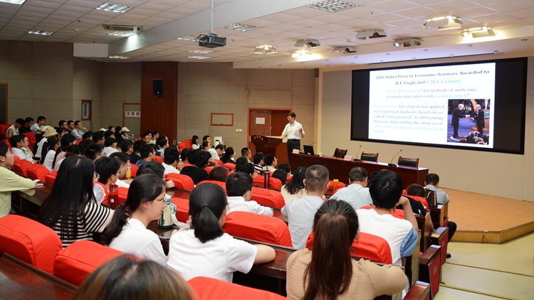 姚峰教授以《多變量時間序列因果分析的理論與應(yīng)用》為題,通過對諾貝爾經(jīng)濟學獎獲得者Granger和Sims的介紹引出近年來關(guān)于時間序列因果關(guān)系方面的研究,介紹多個時間序列之間的因果關(guān)系、單方向因果測量的Wald檢驗。報告結(jié)束后,姚峰教授就統(tǒng)計建模思想的運用與參會師生進行了交流與互動。