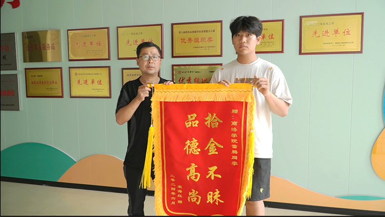 6月18日下午,榆林市民宋先生來到我校,將一面印有“拾金不昧 品德高尚”字樣的錦旗送到電信學院電子信息科學與技術專業(yè)2102班學生雷騰手中,對雷騰同學拾金不昧的高尚品德表示衷心感謝,并對學校培養(yǎng)教育樂于助人的優(yōu)秀學子表示高度贊揚。