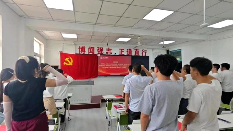 畢業(yè)生黨員面向黨旗,莊嚴(yán)地舉起右手,在字字鏗鏘中重溫入黨誓詞,追憶入黨初心,激勵全體畢業(yè)生黨員賡續(xù)紅色血脈,強化黨員意識,進(jìn)一步激發(fā)黨員使命感和責(zé)任感,終身踐行黨旗下的錚錚誓言,做新時代合格的“答卷人”。