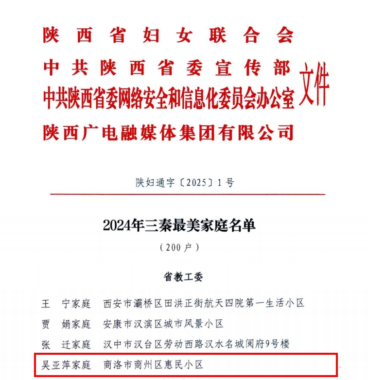 日前,陜西省婦聯(lián)揭曉了2024年“三秦最美家庭”尋找推薦結(jié)果,我校吳亞萍家庭入選上榜,獲得“2024三秦最美家庭”稱號(hào)。