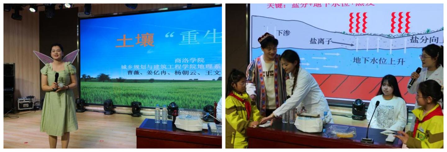 3月26日下午,在商洛市小學(xué)和商州區(qū)第六小學(xué),房舒博士帶領(lǐng)由曹薇、姜億冉、楊朝云、王文睿、高慶欣等地理科學(xué)專業(yè)學(xué)生組成的“土壤奇妙旅團(tuán)”,開展了《土壤重生記》科普情景劇活動。活動以新疆農(nóng)民買買提改良鹽堿地的案例為背景,通過情景劇的形式生動展現(xiàn)了土壤科學(xué)家如何幫助農(nóng)民改善土地質(zhì)量。團(tuán)隊設(shè)計了物理方法、化學(xué)方法和生物方法三種土壤改良技術(shù)的實(shí)驗(yàn)演示,讓學(xué)生們直觀了解土壤改良的科學(xué)原理?;顒舆^程中,團(tuán)隊成員與小學(xué)生積極互動,通過問答和實(shí)驗(yàn)操作,深入淺出地講解了土壤保護(hù)的重要性。這種“實(shí)驗(yàn)+話劇”的創(chuàng)新教學(xué)模式,有效激發(fā)了學(xué)生們對地理科學(xué)的興趣。