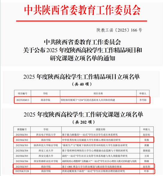 近日,陜西省委教育工委發(fā)布《關(guān)于公布2025年度陜西高校學(xué)生工作精品項(xiàng)目和研究課題立項(xiàng)名單的通知》,經(jīng)個(gè)人申報(bào)、學(xué)校推薦、資格審核、專家評(píng)選、結(jié)果公示、工委研究等程序,我校申報(bào)的1項(xiàng)精品項(xiàng)目和3項(xiàng)研究課題全部獲批,在全省40項(xiàng)精品項(xiàng)目和202項(xiàng)研究課題中排名位居前列,創(chuàng)下我校近年來學(xué)生工作項(xiàng)目、課題省級(jí)立項(xiàng)的最好成績。