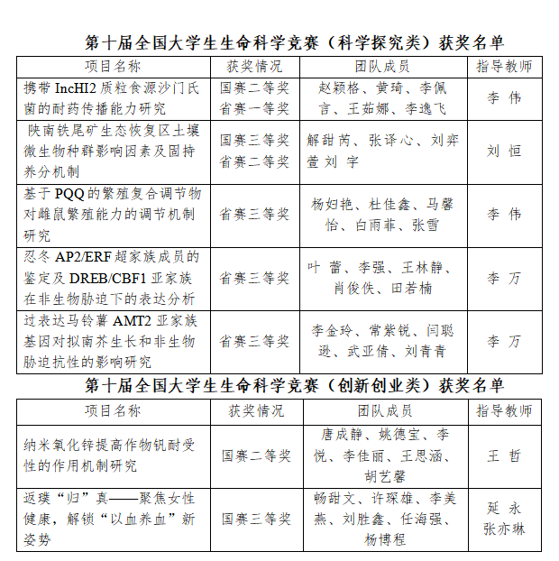 近日,第十屆全國大學(xué)生生命科學(xué)競賽科學(xué)探究類和創(chuàng)新創(chuàng)業(yè)類全國總決賽分別落幕。我校學(xué)生在本屆競賽中表現(xiàn)出色,榮獲第十屆全國大學(xué)生生命科學(xué)競賽科學(xué)探究類全國總決賽二等獎1項、三等獎1項,陜西省賽區(qū)一等獎1項、二等獎1項、三等獎3項,榮獲創(chuàng)新創(chuàng)業(yè)類全國總決賽二等獎和三等獎各1項。