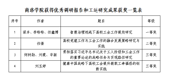 近日,陜西省教科文衛(wèi)體工會發(fā)布了《關(guān)于2024年全省教科文衛(wèi)體系統(tǒng)工會優(yōu)秀調(diào)研報告和工運研究成果評審結(jié)果的通報》,我校工會被評為2024年全省教科文衛(wèi)體工會調(diào)查研究工作先進單位。同時,我校獲得優(yōu)秀調(diào)研報告和工運研究成果一、二等獎各1項,三等獎2項。