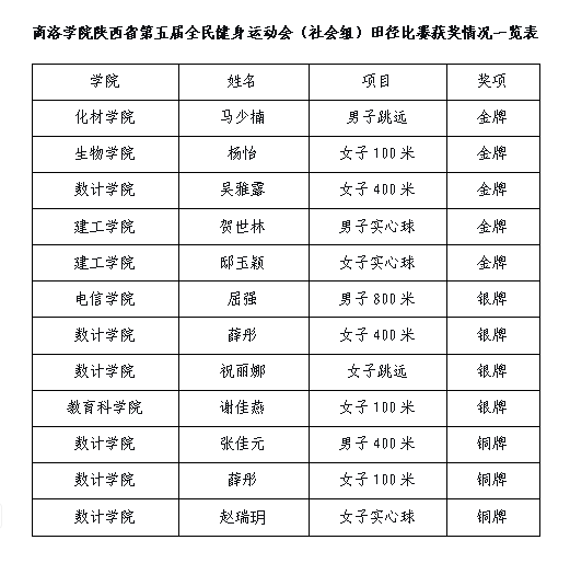 9月14日,陜西省第五屆全民健身運(yùn)動(dòng)會(huì)(社會(huì)組)田徑比賽在山陽(yáng)縣落幕,在巔峰組比賽中,我校教師桑國(guó)鵬獲男子實(shí)心球第一名、王品獲男子跳遠(yuǎn)第二名、閆蘇榮獲女子100米第二名,牛洋洋獲女子實(shí)心球第二名。比賽由體育教學(xué)研究部主任黃顯忠擔(dān)任領(lǐng)隊(duì),王健、王品、桑國(guó)鵬擔(dān)任教練,帶領(lǐng)我校學(xué)生取得5項(xiàng)金獎(jiǎng)、4項(xiàng)銀獎(jiǎng)、3項(xiàng)銅獎(jiǎng)的好成績(jī),充分展現(xiàn)了學(xué)校體育育人的成果和學(xué)子們良好的精神風(fēng)貌。