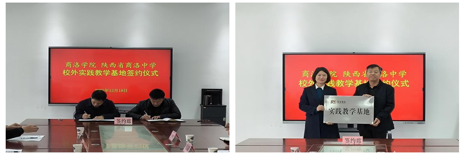 當天上午,“商洛學(xué)院與陜西省商洛中學(xué)校外實踐教學(xué)基地”簽約暨授牌儀式在商洛中學(xué)舉行。商洛中學(xué)教務(wù)處主任劉丹軍與商洛學(xué)院人文學(xué)院院長張文諾共同簽署合作協(xié)議。商洛學(xué)院教務(wù)處處長王怡與商洛中學(xué)副校長武高鵬為基地揭牌,并向商洛中學(xué)贈送教育教學(xué)類書籍。