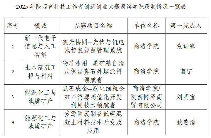 近日,由陜西省科學(xué)技術(shù)協(xié)會、陜西省科技廳、陜西省發(fā)展和改革委員會、陜西省教育廳等單位聯(lián)合主辦的2025年陜西省科技工作者創(chuàng)新創(chuàng)業(yè)大賽圓滿落幕,我校遴選推薦的參賽項目表現(xiàn)突出,共有4項科技成果榮獲大賽三等獎。