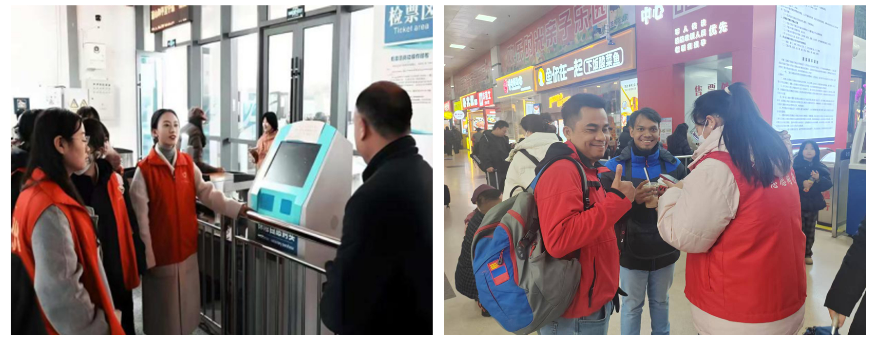 寒假伊始,由商洛學院“驛路同行”“春韻承俗”等多支志愿團隊組成的春運服務隊,分赴西安、商洛、吉林、濟南、襄陽等地交通樞紐,在客流高峰期開展志愿服務工作。身著紅馬甲的志愿者們?yōu)槔先趼每桶徇\行李、為外國游客提供翻譯指引、在站點做好安全保障,用細致耐心的服務守護著萬千旅客的歸途,讓“奉獻、友愛、互助、進步”的志愿精神在春運一線熠熠生輝。