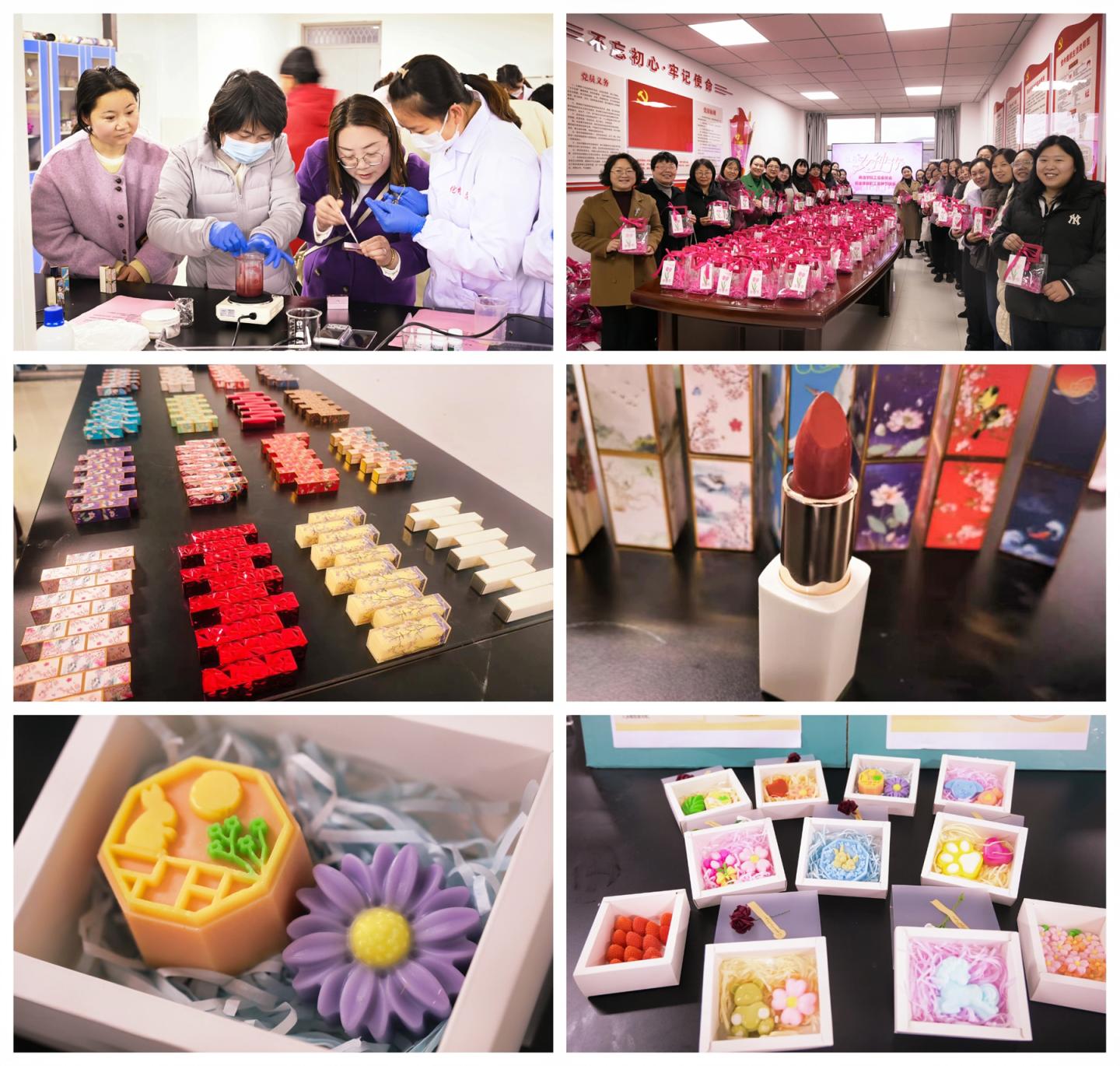活動設置口紅唇膏與手工香皂兩大制作體驗專區(qū),配備專業(yè)指導教師進行全程講解與操作演示。參與人員按照操作指引,依次完成混合、加熱、灌裝、定型等工序,親手制作專屬節(jié)日紀念禮品。現(xiàn)場氣氛熱烈、互動踴躍,大家圍繞制作技巧與創(chuàng)意構思深入交流,在協(xié)作共創(chuàng)中感受手工藝術的獨特魅力,歡聲笑語不斷。