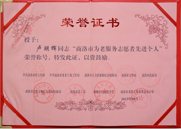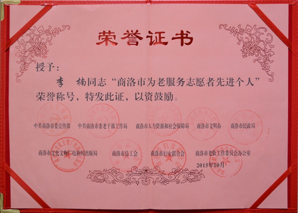 日前,中國老齡事業(yè)發(fā)展基金會發(fā)出《關(guān)于表彰全國首屆北京華夏惠眾養(yǎng)老產(chǎn)業(yè)投資有限公司等百家“敬老志愿服務(wù)模范單位”、溫向明等百名“最美敬老志愿者”、沈慧琴等千名“優(yōu)秀敬老志愿者”的決定》。我校學(xué)生李楠、盧朋輝榮獲全國首屆“優(yōu)秀敬老志愿者”榮譽(yù)稱號。同時二人也獲得商洛市表彰,被評為“商洛市為老服務(wù)志愿者先進(jìn)個人”。