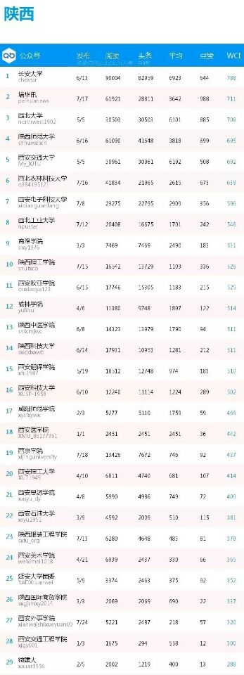 《中國青年報》近日發(fā)布了全國普通高校分省微信公眾號排行榜(2016.3.6-2016.3.12),在陜西高校官微排行榜中,我校以7469的總閱讀量和183的點贊數(shù)列第9名、二本院校第2名。