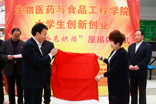 4月11日上午,由我校與陜西森弗天然制品有限公司合作的首個(gè)大學(xué)生創(chuàng)新創(chuàng)業(yè)項(xiàng)目——“哈尼烘焙”屋正式揭牌營(yíng)業(yè)。校黨委副書記彭虎軍與陜西森弗天然制品有限公司總經(jīng)理金淑霞共同為“哈尼烘焙”屋揭牌。揭牌儀式由生物醫(yī)藥與食品工程學(xué)院黨總支副書記丁爭(zhēng)尚主持。