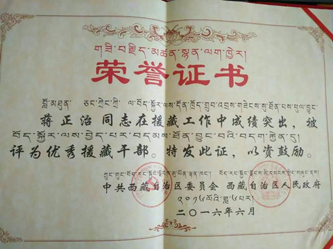 三年來,蔣正治以其優(yōu)良的工作作風,勤懇的工作態(tài)度,得到了援藏工作隊和受援單位的一致好評。2014年3月,蔣正治被評為陜西省優(yōu)秀援藏干部;2015年7月,被評為優(yōu)秀共產(chǎn)黨員;2014年、2015年連續(xù)兩年被評為中共阿里地委黨校優(yōu)秀教師;2016年被評為中共阿里地委黨校先進工作者;在援藏工作結束之際,他又被中共西藏自治區(qū)委員會、西藏自治區(qū)人民政府評為“優(yōu)秀援藏干部”,受到表彰。