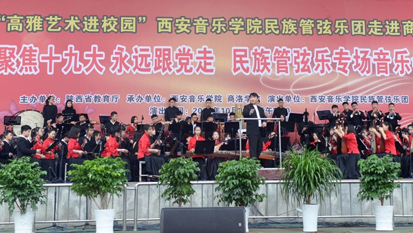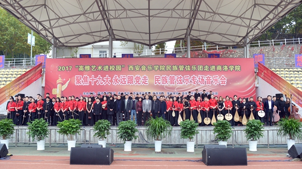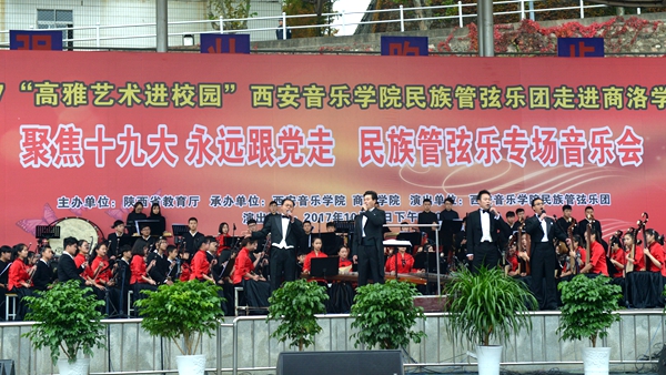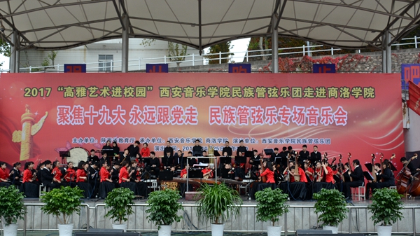 10月25日,由陜西省教育廳主辦的陜西省2017年“高雅藝術(shù)進(jìn)校園”系列活動(dòng)——西安音樂學(xué)院民族管弦樂專場(chǎng)音樂會(huì)在我校舉辦,音樂會(huì)以“聚焦十九大 永遠(yuǎn)跟黨走”為主題。來(lái)自西安音樂學(xué)院的85名演員為我校師生奉獻(xiàn)了一場(chǎng)精彩的視聽盛宴。西安音樂學(xué)院紀(jì)委書記劉曉霞、副書記全勇,校領(lǐng)導(dǎo)龍治剛、王思懷、魏書堂、劉寶盈、劉勇,來(lái)商參加漢江流域大學(xué)聯(lián)盟宣傳思想工作聯(lián)席會(huì)的代表與全校師生一同欣賞了音樂會(huì)。