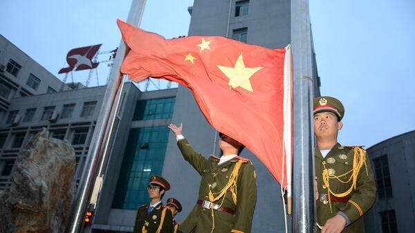 升旗儀式上,鮮艷的五星紅旗在晨曦中飛揚(yáng)。