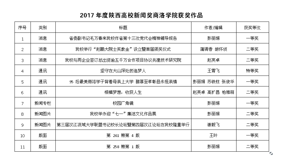 在2017年度陜西高校新聞獎評選中,我校共有3件消息類作品、3件通訊類作品、1件新聞專欄類、2件新聞圖片類、2件版面類作品獲獎。其中《省委副書記毛萬春來我校作省第十三次黨代會精神輔導報告》獲得消息類一等獎,《我校舉行“趙鵬大院士獎教金”設立暨首屆頒獎儀式》《我校與兩企業(yè)簽訂總出資逾五千萬合作項目協(xié)議共建技術研究院》獲得消息類二等獎;《堅守在大山深處的追夢人》獲得通訊類特等獎,《95后最美商洛學子背著母親上大學 醇厚至孝彰顯永恒親情》獲得通訊類一等獎,《根植夢想,收獲人生》獲得通訊類二等獎;《校園廣角鏡》獲得新聞專欄類一等獎;《我校舉辦迎“七一”廉潔文化作品展》《第三屆漢江流域大學聯(lián)盟書記校長論壇暨第四屆漢江論壇在我校隆重舉行》獲得新聞圖片類二等獎;校報第261 期第 4 版獲得版面類一等獎,第258 期第 1 版獲得版面類二等獎。