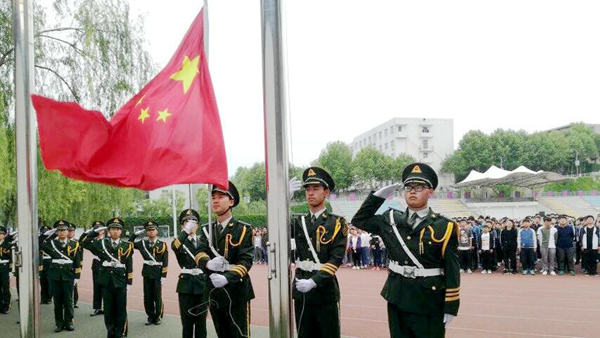 在雄壯的國歌聲中,鮮艷的五星紅旗冉冉升起,迎風(fēng)飄揚(yáng)。在場每一個(gè)人都在心中默默祝福祖國不斷強(qiáng)大富強(qiáng),早日實(shí)現(xiàn)中華民族偉大復(fù)興的“中國夢(mèng)”。在國歌聲響起時(shí),景觀平臺(tái)和操場上的行人也都自覺停下了腳步,向國旗行注目禮。