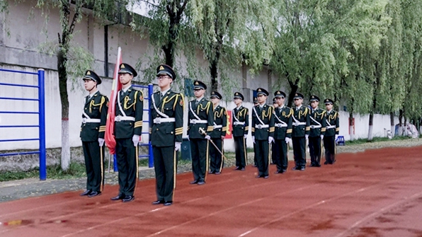 “升國旗,奏唱國歌,行注目禮!”隨著主持人的口令,雄壯的《義勇軍進(jìn)行曲》奏響。旗手振臂一揮將國旗展向空中,鮮艷的五星紅旗在國旗護(hù)衛(wèi)隊員莊嚴(yán)軍禮的映襯下,迎著徐徐的微風(fēng)冉冉升起,飄揚(yáng)在校園上空,為雨后的校園增添了一抹莊嚴(yán)的色彩。