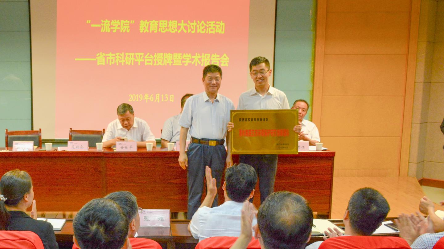 6月13日,我校舉行“一流學(xué)院”教育思想大討論活動(dòng)——省市科研平臺(tái)授牌暨學(xué)術(shù)報(bào)告會(huì)。陜西省教育廳科技處處長(zhǎng)甘世平、商洛市科技局局長(zhǎng)趙緒春,我校黨委書(shū)記龍治剛、校長(zhǎng)范新會(huì)、紀(jì)委書(shū)記王思懷、副校長(zhǎng)劉寶盈出席授牌儀式。西安工業(yè)大學(xué)文學(xué)院院長(zhǎng)馮希哲教授、西安郵電大學(xué)經(jīng)濟(jì)與管理學(xué)院院長(zhǎng)張鴻教授,我校相關(guān)職能部門(mén)負(fù)責(zé)人及各院(部)院長(zhǎng)、主任、科研副院長(zhǎng)、科研秘書(shū)等教師代表參加了授牌儀式。授牌儀式由劉寶盈主持。
