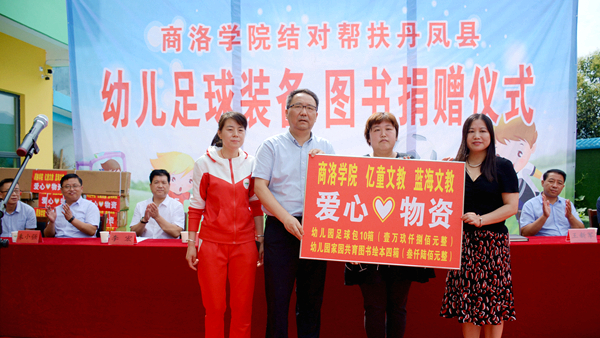 7月9日,我校與武漢億童文教有限公司、陜西藍海文教科技有限公司攜手為丹鳳縣棣花鎮(zhèn)兩嶺幼兒園送去愛心足球運動包、愛心圖書等價值貳萬多元的物資。校雙百工程領(lǐng)導(dǎo)小組組長、黨委書記龍治剛,副組長、副校長劉寶盈,丹鳳縣副縣長楊思飛,武漢億童文教有限公司、陜西藍海文教科技有限公司顧問專家趙小紅等領(lǐng)導(dǎo)嘉賓出席捐贈儀式。我??萍继?、體育教學(xué)研究部及丹鳳縣少兒足球項目負責(zé)人,丹鳳縣科教體局黨政負責(zé)人,丹鳳縣農(nóng)業(yè)局相關(guān)負責(zé)人等工作人員與兩嶺幼兒園全體師生家長共同參加了捐贈活動。