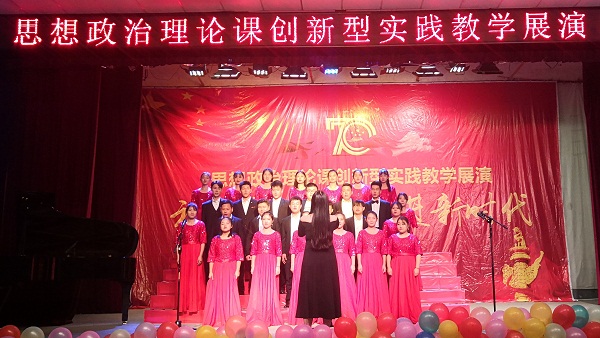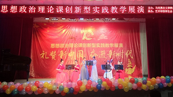 為慶祝中華人民共和國成立70周年,積極推進習(xí)近平新時代中國特色社會主義思想進教材、進課堂、進頭腦,認(rèn)真落實黨和國家對高校思想政治理論課建設(shè)提出的各項要求,增強思政課教學(xué)的吸引力和感染力,9月28日晚,由馬克思主義學(xué)院主辦的“禮贊新中國,奮進新時代”思想政治理論課創(chuàng)新型實踐教學(xué)展演活動在大學(xué)生活動中心舉辦。教務(wù)處相關(guān)負(fù)責(zé)人,馬克思主義學(xué)院全體教師及本學(xué)期部分思政課教學(xué)班級學(xué)生400余人共同觀看了此次展演。