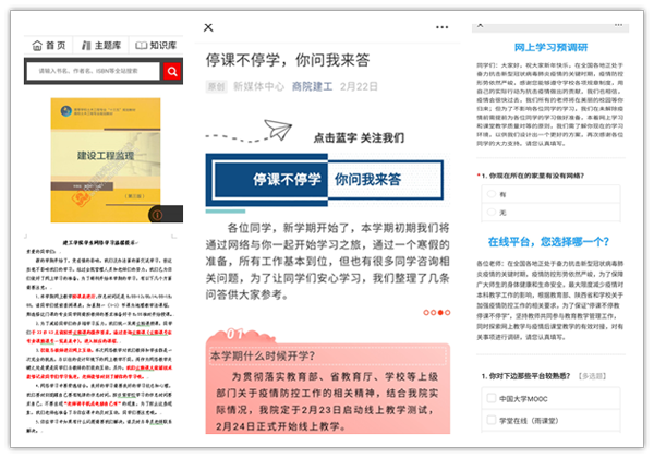 以生為本,科學(xué)規(guī)劃,適切引導(dǎo)“課堂教學(xué)”平穩(wěn)過渡“線上教學(xué)”。為了保障教學(xué)工作順利開展,建工學(xué)院制定《城鄉(xiāng)規(guī)劃與建筑工程學(xué)院疫情防控期間教學(xué)工作實(shí)施方案》,成立以院長(zhǎng)楊存典為組長(zhǎng)的教學(xué)工作領(lǐng)導(dǎo)小組,提出“學(xué)院保障技術(shù),教師設(shè)計(jì)內(nèi)容和避免多端開課”的要求,組建教學(xué)運(yùn)行、教學(xué)督導(dǎo)、學(xué)生管理和技術(shù)保障工作組,制定工作任務(wù)及計(jì)劃表,逐項(xiàng)落實(shí)責(zé)任;堅(jiān)持全面服務(wù)師生,面向?qū)W生開展網(wǎng)上學(xué)習(xí)調(diào)查、為學(xué)生制作網(wǎng)上學(xué)習(xí)指南、系主任推薦專業(yè)書籍、平臺(tái)提供電子教材等措施;充分了解學(xué)生網(wǎng)絡(luò)學(xué)習(xí)條件,主動(dòng)解決學(xué)生學(xué)習(xí)資源單一問題、積極搭建學(xué)習(xí)平臺(tái)和營造線上學(xué)習(xí)氛圍,面向教師開展技術(shù)及教學(xué)方法培訓(xùn)、制作網(wǎng)絡(luò)教學(xué)指導(dǎo)手冊(cè)、制定直播教學(xué)指南,引導(dǎo)教師理解信息化教學(xué)真正內(nèi)涵。全體教師全身心投入教學(xué)的各項(xiàng)準(zhǔn)備工作中,結(jié)合公共課和專業(yè)課特點(diǎn),合理規(guī)劃課程分批分段上線,理論課采用“直播+互動(dòng)”兼顧“異步與實(shí)時(shí)”,方便網(wǎng)絡(luò)條件差的學(xué)生在合適時(shí)間進(jìn)行異步學(xué)習(xí),部分實(shí)驗(yàn)課依托教育部產(chǎn)學(xué)合作項(xiàng)目實(shí)驗(yàn)平臺(tái)、現(xiàn)有的省校級(jí)虛擬仿真實(shí)驗(yàn)項(xiàng)目資源,為學(xué)生身臨其境開展工程實(shí)驗(yàn)創(chuàng)造條件。離校不離教,質(zhì)量不掉線,學(xué)院倡導(dǎo)教師采取積極探索基于問題或項(xiàng)目的網(wǎng)上教學(xué)方式,充分調(diào)動(dòng)學(xué)生的興趣和互動(dòng)交流積極性,嚴(yán)把直播教學(xué)時(shí)間關(guān),杜絕“課堂搬家”“滿堂灌”和“超長(zhǎng)時(shí)間授課”,探索不同課程線上教學(xué)的適切性。