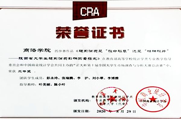 此次大賽省選拔賽共有來(lái)自西北大學(xué)、陜西師范大學(xué)、西安財(cái)經(jīng)大學(xué)、長(zhǎng)安大學(xué)、西安石油大學(xué)等20多所高校的108支隊(duì)伍參加。學(xué)校高度重視此次大賽,參賽學(xué)生自2019年10月開(kāi)始積極備賽,在教務(wù)處、數(shù)學(xué)與計(jì)算機(jī)應(yīng)用學(xué)院等相關(guān)單位的大力支持以及多位老師的悉心指導(dǎo)下,經(jīng)過(guò)專業(yè)知識(shí)個(gè)人網(wǎng)考、實(shí)踐賽校內(nèi)選拔,共有兩支隊(duì)伍進(jìn)入陜西省賽區(qū)選拔賽。經(jīng)過(guò)激烈比拼,參賽隊(duì)伍憑借詳實(shí)規(guī)范的統(tǒng)計(jì)調(diào)查方案和數(shù)據(jù)分析報(bào)告以及大方得體的線上表現(xiàn),由我校應(yīng)用統(tǒng)計(jì)學(xué)專業(yè)17級(jí)學(xué)生彭永玲、張瑞騰、李滬、劉小翠、李博雅代表隊(duì)的作品《超前消費(fèi)是“救命稻草”還是“精神鴉片”——陜西省大學(xué)生超前消費(fèi)影響因素探究》榮獲國(guó)家三等獎(jiǎng)。