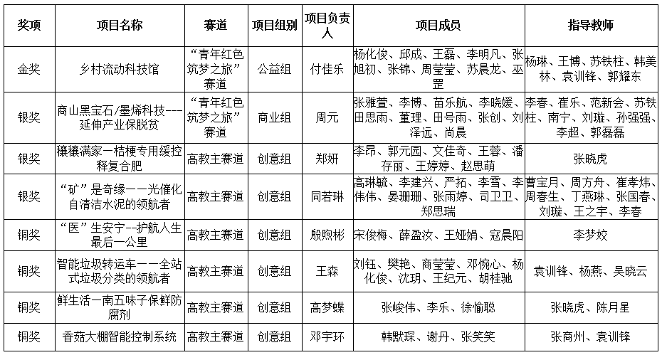 本屆大賽自今年6月啟動(dòng)以來,我省共有106所學(xué)校報(bào)名參加,參賽項(xiàng)目突破4萬項(xiàng),較去年增加近3000項(xiàng),參賽學(xué)生突破18.4萬人次,較去年增加1.8萬,經(jīng)校級(jí)初賽、網(wǎng)絡(luò)初審、會(huì)議評(píng)審、線上路演、評(píng)委會(huì)評(píng)審等環(huán)節(jié)后,最終產(chǎn)生金獎(jiǎng)100項(xiàng),單項(xiàng)獎(jiǎng)7項(xiàng)。我校化材學(xué)院學(xué)生付佳樂負(fù)責(zé)的《鄉(xiāng)村流動(dòng)科技館》項(xiàng)目獲“青年紅色筑夢之旅”賽道金獎(jiǎng);化材學(xué)院學(xué)生周元負(fù)責(zé)的《商山黑寶石/墨烯科技---延伸產(chǎn)業(yè)保脫貧》項(xiàng)目獲得“青年紅色筑夢之旅”賽道銀獎(jiǎng);生物學(xué)院學(xué)生鄭妍負(fù)責(zé)的《穰穰滿家—桔梗專用緩控釋復(fù)合肥》項(xiàng)目、化材學(xué)院學(xué)生同若琳負(fù)責(zé)的《“礦”是奇緣——光催化自清潔水泥的領(lǐng)航者》項(xiàng)目獲得高教主賽道銀獎(jiǎng);健康管理學(xué)院學(xué)生殷煦彬負(fù)責(zé)的《“醫(yī)”生安寧--護(hù)航人生最后一公里》項(xiàng)目、生物學(xué)院學(xué)生高夢蝶負(fù)責(zé)的《鮮生活—南五味子保鮮防腐劑》項(xiàng)目、電信學(xué)院學(xué)生王森負(fù)責(zé)的《智能垃圾轉(zhuǎn)運(yùn)車——全站式垃圾分類的領(lǐng)航者》項(xiàng)目、電信學(xué)院學(xué)生鄧宇環(huán)負(fù)責(zé)的《香菇大棚智能控制系統(tǒng)》項(xiàng)目獲得高教主賽道銅獎(jiǎng)。