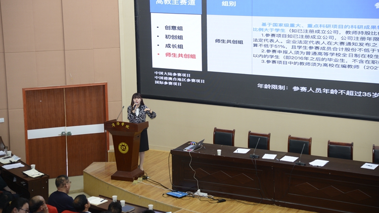 啟動(dòng)儀式結(jié)束后,楊丹為師生作了專題輔導(dǎo)報(bào)告。她結(jié)合多年“互聯(lián)網(wǎng)+”大賽指導(dǎo)經(jīng)驗(yàn),分別從大賽背景、規(guī)則解讀、項(xiàng)目溯源、評審視角、備賽要點(diǎn)五個(gè)方面,全面細(xì)致、深入淺出的為師生剖析了本屆“互聯(lián)網(wǎng)+”大賽的目標(biāo)任務(wù)、賽項(xiàng)制度和關(guān)鍵環(huán)節(jié),重點(diǎn)介紹了備賽、預(yù)賽、省賽等不同階段的目標(biāo)任務(wù)。