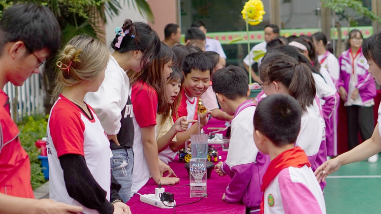 活動(dòng)中,“人才服務(wù)團(tuán)”的6名教師作了精彩的科普知識講座。生物學(xué)院教師劉長命、王洋,化材學(xué)院教師王毅夢分別作了題為《植物科學(xué)與我們的生活》《豐富多彩的昆蟲世界及人工琥珀標(biāo)本制作》《“形狀記憶”小星星》的知識講座。電信學(xué)院教師李亞文向?qū)W生們展示了大學(xué)生創(chuàng)新創(chuàng)業(yè)作品《神奇的校車》、趙杰講授了《少兒機(jī)器人編程》課程、王博講解了《螃蟹機(jī)器人和人體感應(yīng)太陽花的奧秘》。他們的講解風(fēng)趣幽默、形象生動(dòng)、通俗易懂,激發(fā)了現(xiàn)場學(xué)生們探索科學(xué)的興趣,現(xiàn)場氣氛輕松歡快,歡笑聲和掌聲不斷。