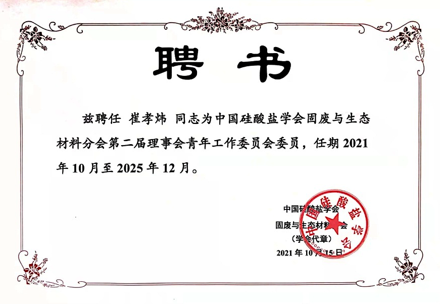 崔孝煒博士主要從事固體廢棄物綜合利用的研究工作,先后榮獲陜西省科學(xué)技術(shù)二等獎1項,市廳級科學(xué)技術(shù)獎7項,陜西省教育教學(xué)成果一、二等獎各1項,商洛學(xué)院教學(xué)成果特等獎2項。主持陜西省自然科學(xué)基金、陜西省十三五教育規(guī)劃課題等各類項目20余項。2018年入選陜西省高校青年杰出人才支持計劃,同年被評為“陜西省崗位學(xué)雷鋒標(biāo)兵”、全省高校崗位學(xué)雷鋒標(biāo)兵。2019年被評為陜西省優(yōu)秀教師。2020年入選“陜西省高層次人才特殊支持計劃”。本次被聘為中國硅酸鹽學(xué)會固廢與生態(tài)材料分會第二屆理事會青年工作委員會委員,是繼他被聘為中國有色金屬產(chǎn)業(yè)技術(shù)創(chuàng)新戰(zhàn)略聯(lián)盟專家委員會委員、入選有色金屬智庫認證專家之后,再次擔(dān)任重要學(xué)術(shù)團體職務(wù)。
