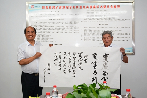 參觀時(shí),趙鵬大院士親筆為重點(diǎn)實(shí)驗(yàn)室題寫“變廢為寶,變害為利”,并祝愿我校尾礦資源綜合利用重點(diǎn)實(shí)驗(yàn)室建成國內(nèi)一流、世界先進(jìn)的實(shí)驗(yàn)室?;膶W(xué)院黨總支書記劉全民代表師生向趙鵬大院士贈(zèng)送書法繪畫作品。