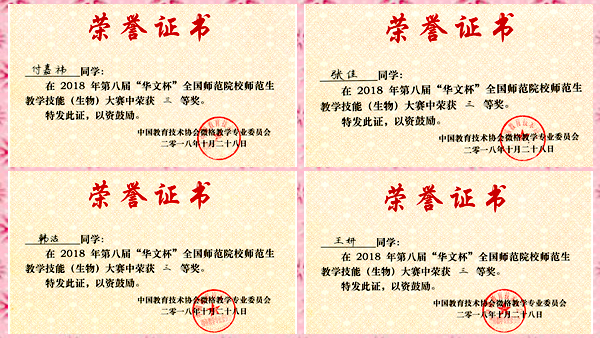為了參加此次大賽,我校生物學(xué)院認(rèn)真組織選拔參賽學(xué)生,指導(dǎo)教師精心指導(dǎo)學(xué)生備賽,按微格教學(xué)的要求和方法反復(fù)訓(xùn)練學(xué)生進(jìn)行模擬授課。4名參賽學(xué)生最終憑借穩(wěn)定的發(fā)揮在激烈的教學(xué)技能比賽中分別獲得三等獎的好成績。
