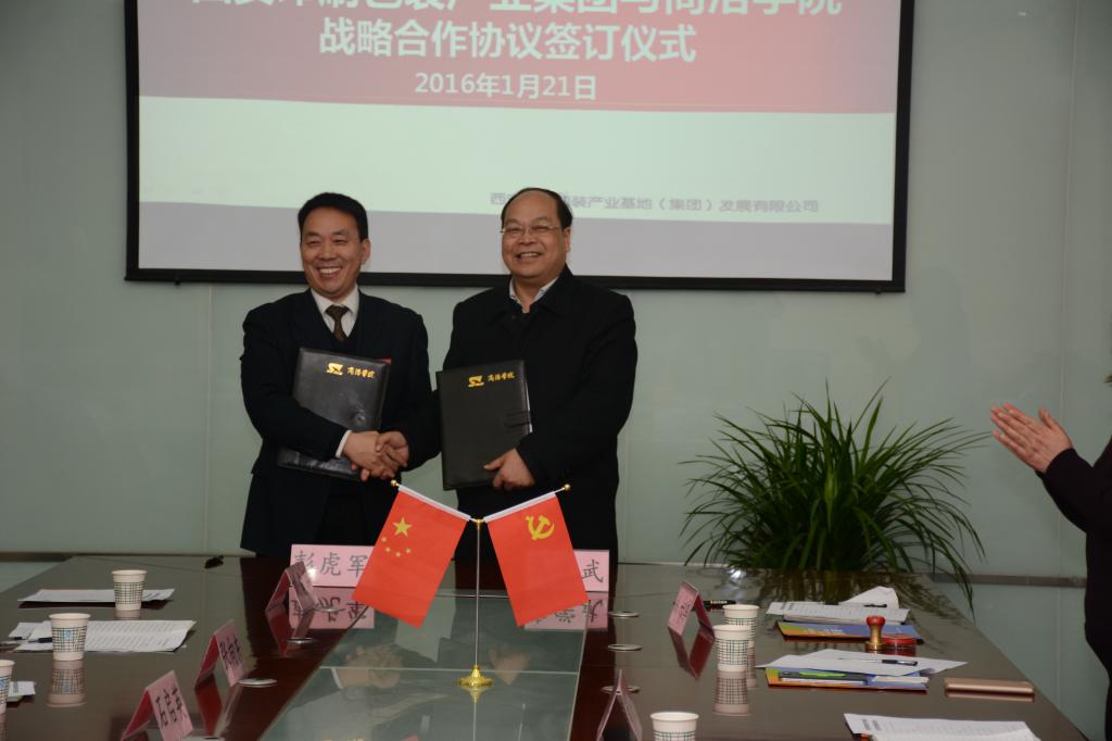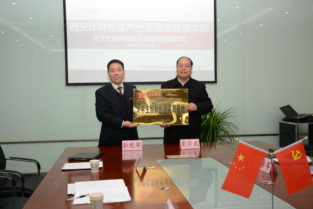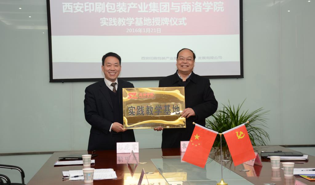 2016年1月21日,我校與西安印刷包裝產(chǎn)業(yè)集團(tuán)在西安經(jīng)濟(jì)技術(shù)開(kāi)發(fā)區(qū)草灘生態(tài)產(chǎn)業(yè)園簽署戰(zhàn)略合作協(xié)議并舉行授牌儀式。校黨委副書(shū)記彭虎軍與西安印刷包裝產(chǎn)業(yè)集團(tuán)董事長(zhǎng)袁學(xué)武代表校企雙方在協(xié)議上簽字。彭虎軍在簽約儀式之后向西安印刷包裝產(chǎn)業(yè)集團(tuán)授予“商洛學(xué)院大學(xué)生創(chuàng)新創(chuàng)業(yè)實(shí)踐基地”和“商洛學(xué)院教學(xué)實(shí)踐基地”牌。學(xué)校黨政辦公室、教務(wù)處、學(xué)生處、招生就業(yè)處等部門領(lǐng)導(dǎo),西安印刷包裝產(chǎn)業(yè)集團(tuán)黨總支副書(shū)記劉海軍及集團(tuán)有關(guān)部門人員參加了簽約授牌儀式。簽約授牌儀式由劉海軍主持。