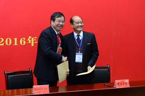 10月23日,在商洛學(xué)院創(chuàng)建一流應(yīng)用型本科院校動(dòng)員大會(huì)上,我校與陜西師范大學(xué)簽訂《戰(zhàn)略合作協(xié)議》,黨委書記、校長劉建林與陜西師范大學(xué)副校長黨懷興代表雙方在協(xié)議書上簽字。