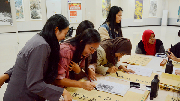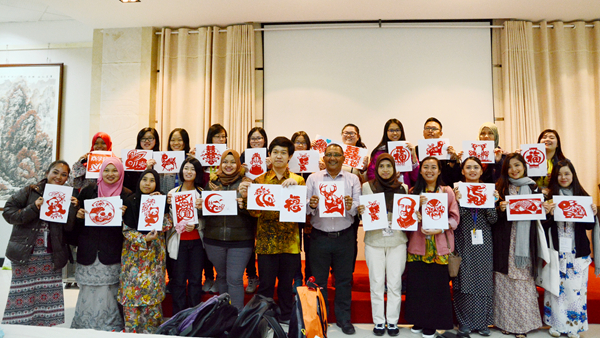 16日下午,交流團師生聽取了中國傳統(tǒng)禮儀課,并與我校師生共同探討、展示了中馬兩國不同的禮儀;之后在我校教師的指導下學習中國書法和剪紙。他們在課堂上呈現(xiàn)出了濃厚的興趣和極高的熱情,并通過學習,完成了自己的書法和剪紙作品。