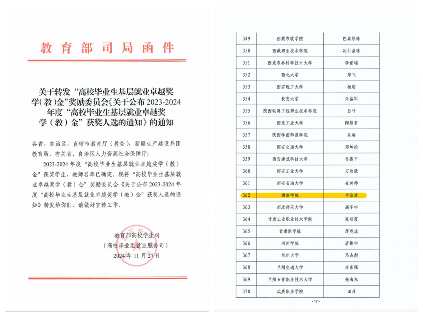 日前,教育部高校學(xué)生司發(fā)布了《關(guān)于公布2023-2024年度“高校畢業(yè)生基層就業(yè)卓越獎學(xué)(教)金”獲獎人選的通知》,我?;瘜W(xué)工程與現(xiàn)代材料學(xué)院化學(xué)專業(yè)2018屆畢業(yè)生李浩波赴新疆基層就業(yè)事跡成功入選,獲評全國“高校畢業(yè)生基層就業(yè)卓越獎學(xué)金”,陜西省高校共有12名優(yōu)秀畢業(yè)生獲此殊榮,也是我校畢業(yè)生首次獲得該項獎勵。