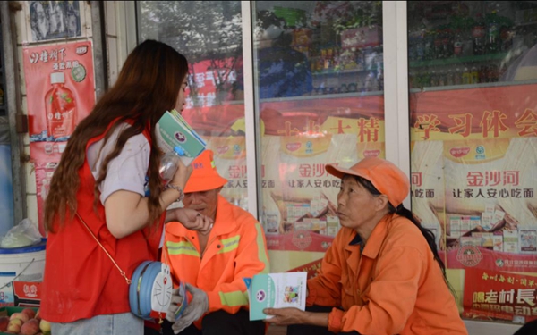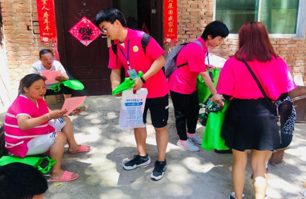 實踐團成員給當?shù)鼐用穹职l(fā)環(huán)保購物袋