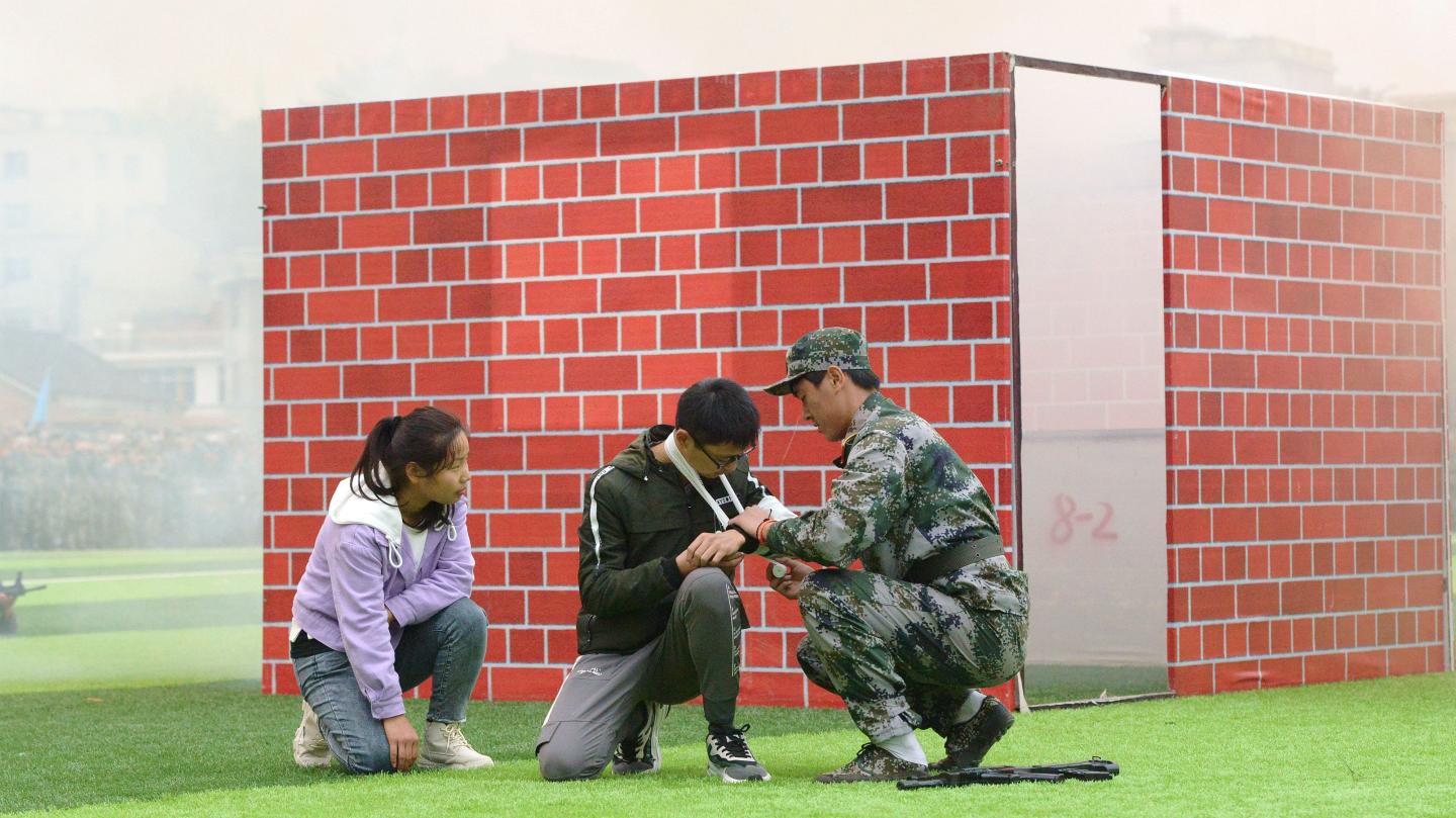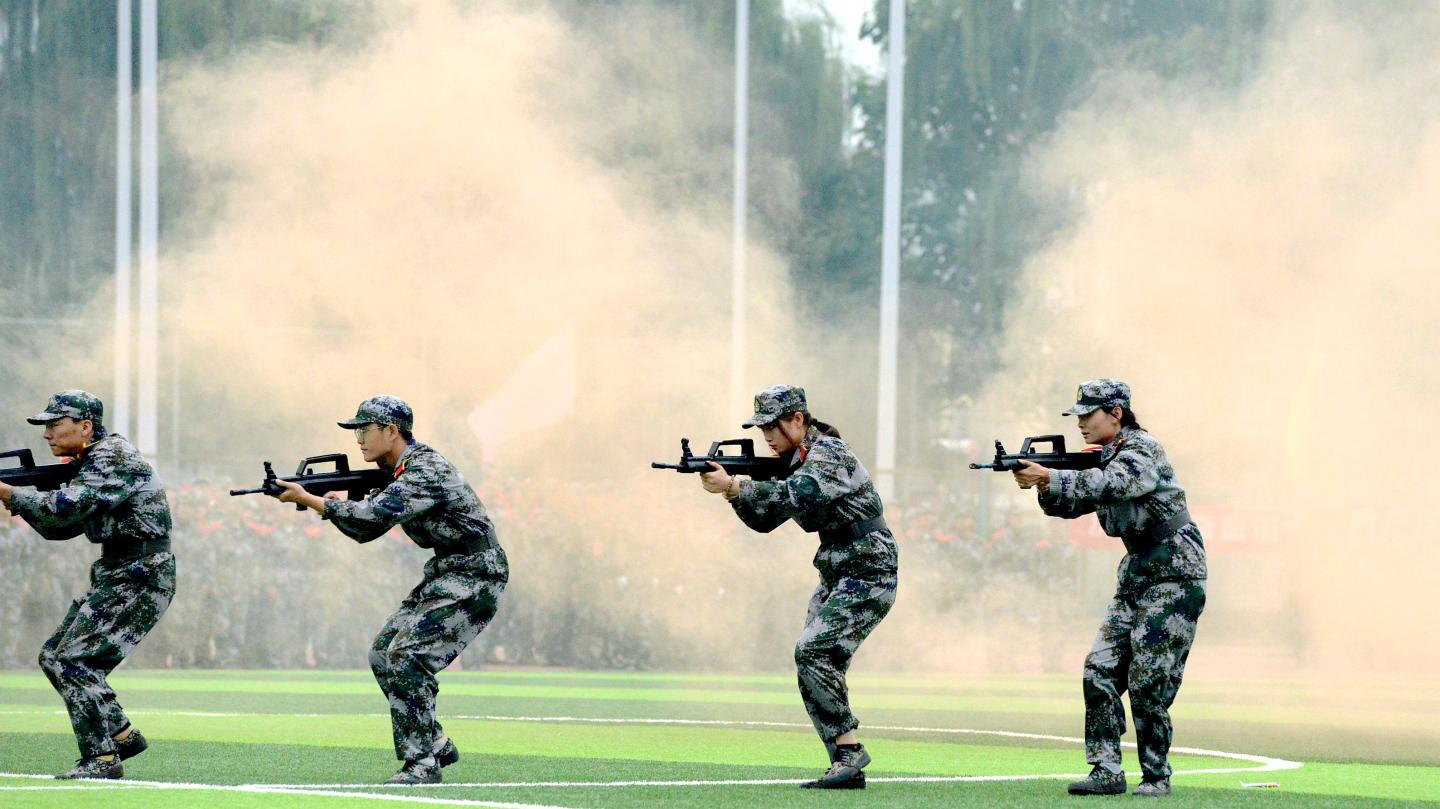 分列式結(jié)束后,軍訓(xùn)教官和學(xué)生進(jìn)行了匕首操、花樣隊(duì)列、五步拳、擒敵術(shù)、反恐演練等匯報(bào)表演。女兵們表演的匕首操干凈利落、整齊劃一,將“巾幗不讓須眉”之勢展現(xiàn)的淋漓盡致;花樣隊(duì)列表演中同學(xué)們擺出“商院2020”“不忘初心、牢記使命”等字樣,展現(xiàn)了商院學(xué)子勇?lián)鷷r(shí)代使命的志向決心;五步拳表演套路連貫、氣勢如虹,拳腳虎虎生威,擒敵術(shù)表演配合默契、果敢勇猛,盡顯軍人本色;反恐演練與戰(zhàn)地救護(hù),模擬展示了多種反恐戰(zhàn)術(shù)隊(duì)形、戰(zhàn)術(shù)手語、戰(zhàn)術(shù)基本持槍動作以及相對應(yīng)的實(shí)戰(zhàn)技能,將現(xiàn)場氣氛推向高潮,引得師生陣陣掌聲。