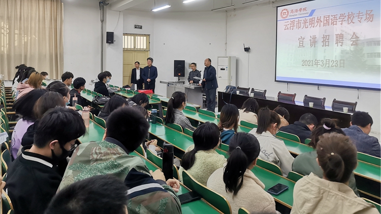 3月23日,廣東省云浮市光明外國(guó)語(yǔ)學(xué)校校長(zhǎng)梅永華、校辦主任劉偉華等一行4人來(lái)到我校,舉辦專(zhuān)場(chǎng)宣講招聘會(huì),為我校畢業(yè)生帶來(lái)53個(gè)就業(yè)崗位。2021屆教育類(lèi)相關(guān)專(zhuān)業(yè)200余名畢業(yè)生參加了招聘會(huì)。這是我校積極踐行“以生為本”工作理念,充分克服疫情對(duì)畢業(yè)生就業(yè)帶來(lái)的不利影響,為畢業(yè)生舉辦的小規(guī)模、多場(chǎng)次招聘會(huì)中一場(chǎng)。