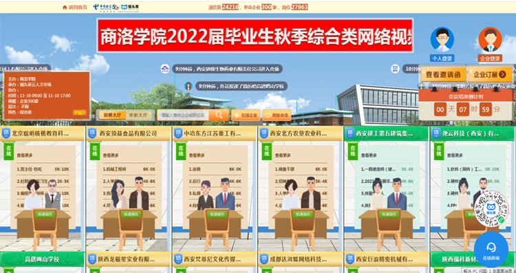 本次網(wǎng)絡(luò)視頻招聘會共有西安建工第五建筑集團(tuán)有限公司、中航鋰電科技有限公司、北京聰明核桃教育科技有限公司、永壽高新醫(yī)院等省內(nèi)外300家用人單位參會;提供涉及文體教育、IT通信、醫(yī)療衛(wèi)生、建筑工程、信息服務(wù)、機(jī)電制造等9大行業(yè)領(lǐng)域的就業(yè)崗位2萬余個;吸引了近2000余名校內(nèi)外畢業(yè)生參會,累計(jì)投遞簡歷3239份。
