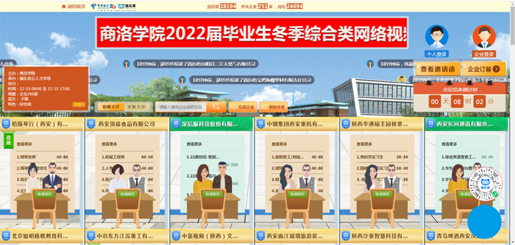 12月15日,我校舉辦2022屆畢業(yè)生冬季綜合類網(wǎng)絡(luò)視頻招聘會(第二場)。省內(nèi)外250多家用人單位參加,提供涉及IT通信、教育科技、醫(yī)療衛(wèi)生、建筑工程、信息服務(wù)、機電制造等9大行業(yè)領(lǐng)域的就業(yè)崗位2萬余個,吸引了近2000余名校內(nèi)外畢業(yè)生參會,累計投遞簡歷1887份。其中,我校入場求職學(xué)生421人,初步達(dá)成就業(yè)意向598人次。