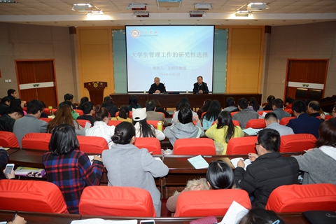 在報告中,左曉民教授從輔導員工作質(zhì)量及職業(yè)素養(yǎng)出發(fā),“以問題為導向”,對大學生管理工作的研究性選擇問題進行了深入分析和專業(yè)指導。他指出,目前學生工作平臺越來越多,機遇越來越多,需要輔導員具備越來越強的工作能力;廣大輔導員應將視點聚焦于大學生管理中,鎖定自己的職業(yè)生涯,經(jīng)常進行理性反思,將專業(yè)優(yōu)勢轉(zhuǎn)化為職業(yè)優(yōu)勢,助推學生成長。