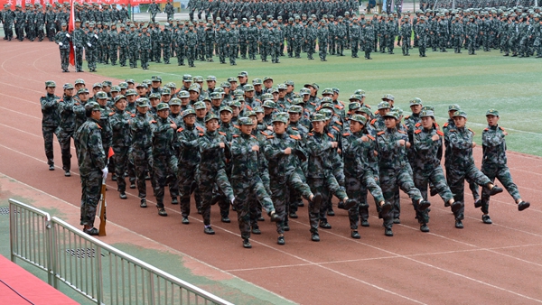 分列式結(jié)束后,我校學生進行了花樣隊列、女子防身術(shù)、捕俘拳、捕俘刀、突擊演練與戰(zhàn)地救護、韻律操等匯報表演。伴隨著悠揚的旋律,女兵們擺出了巨大的“中國”“喜迎十九大”等造型,祝福黨的十九大勝利召開。由男兵們表演的捕俘拳動作精煉、氣勢磅礴,贏得了現(xiàn)場陣陣熱烈的掌聲。突擊演練與戰(zhàn)地救護展示了戰(zhàn)術(shù)手語、戰(zhàn)術(shù)隊形和破襲戰(zhàn)斗等,同學們配合密切、組織嚴謹,展示了良好的戰(zhàn)斗技能和戰(zhàn)術(shù)素養(yǎng),將現(xiàn)場氣氛推向了高潮。