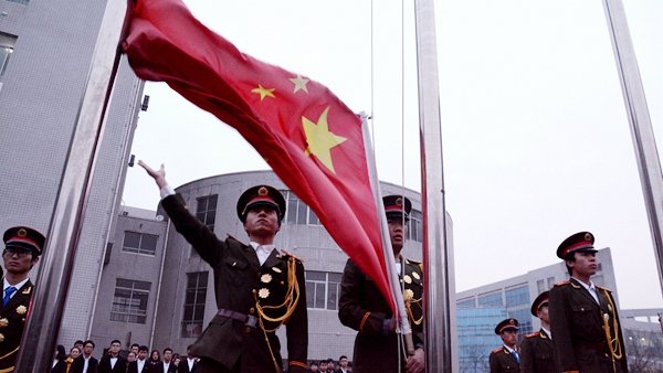 莊嚴嘹亮的國歌拉開了儀式的序幕。鮮艷的五星紅旗冉冉升起,旗手們踏著矯健的步伐,以飽滿的熱情,莊嚴的護送五星紅旗走向升旗臺。全體人員肅立向國旗行注目禮。