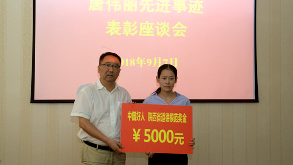 龍治剛代表學(xué)校向唐偉麗頒發(fā)5000元獎(jiǎng)金。彭虎軍宣讀了《中共商洛學(xué)院委員會(huì)關(guān)于向“中國好人”“陜西省第五屆道德模范”唐偉麗同學(xué)學(xué)習(xí)的通知》。