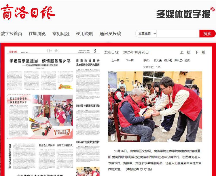 10月26日,由商州區(qū)文旅局、商洛學(xué)院藝術(shù)學(xué)院等主辦的“情暖重陽(yáng) 愛滿百順”慰問活動(dòng)在商洛市百順山莊老年公寓舉行。志愿者為老人表演節(jié)目、剪指甲,并送去水果等慰問品,讓老人們感受到來自社會(huì)各界的關(guān)愛。 (本報(bào)記者 方 方 攝)