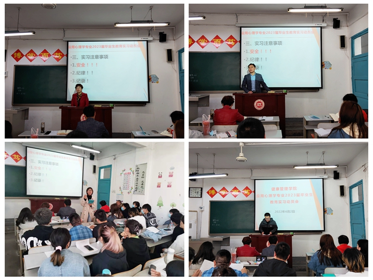 根據(jù)我校畢業(yè)生實(shí)習(xí)相關(guān)要求和學(xué)院工作安排。4月2日,健康管理學(xué)院召開(kāi)應(yīng)用心理學(xué)專業(yè)2023屆畢業(yè)生教育實(shí)習(xí)動(dòng)員會(huì),62名實(shí)習(xí)生將奔赴商洛中學(xué)、商洛市小學(xué)等7所中小學(xué)校,開(kāi)展為期12周的教育實(shí)習(xí)。黨總支書(shū)記魯綿茸出席會(huì)議并講話,實(shí)習(xí)指導(dǎo)教師、輔導(dǎo)員、2023屆應(yīng)用心理學(xué)專業(yè)全體畢業(yè)生參加動(dòng)員會(huì),會(huì)議由心理學(xué)系主任梁豐主持。